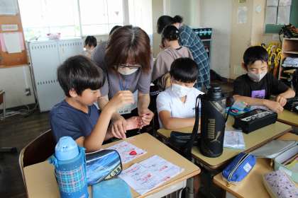 家庭科の時間には、ボランティアの方に教えていただきながら、玉結びや玉止めの練習をしました。