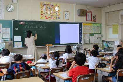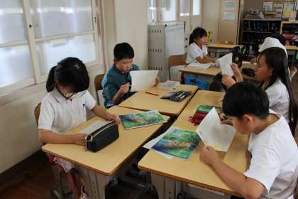 国語の時間には、「ワニのおじいさんのたから物」について、登場人物や出来事など、物語の内容を短くまとめて「しょうかいカード」を作り、感想を伝え合いました。ローマ字の練習では、伸ばす音の書き方を学びました。