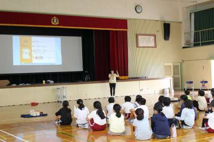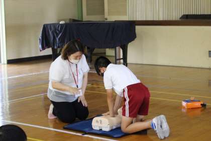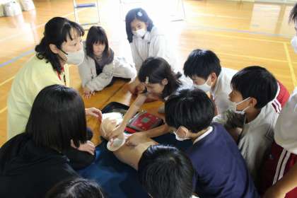 消防署の方を講師に迎え、心臓マッサージの仕方やAEDの使い方を教えていただき、実践しました。