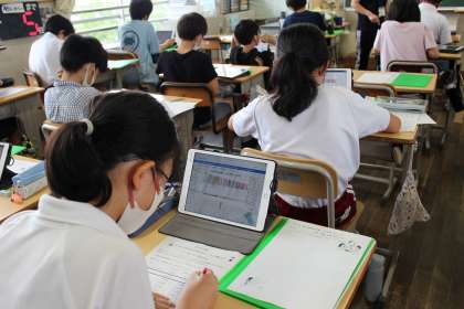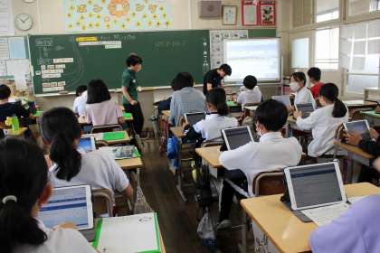 中央図書館から講師を迎え、総合学習での調べ学習の仕方を教えていただき、フィールドワークに向けて、自分なりの問いを作りました。