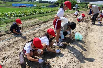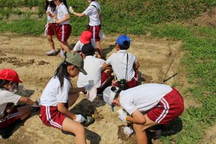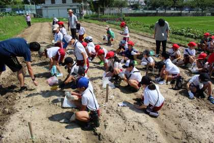 地域講師の方に教えていただきながら、大豆の種をまきました。