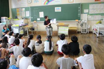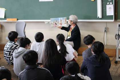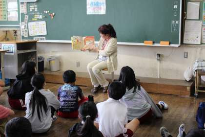 朝の活動で、4〜6年生は読み聞かせをしていただきました。