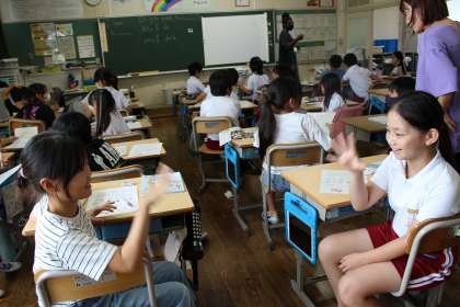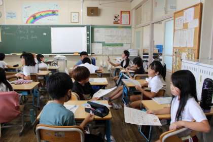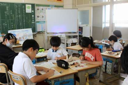 国語の時間には、2つの広告を読み比べて、どんな違いがあるのかを考えました。外国語活動では、文房具の言い方に慣れ親しみ、持っている文房具を尋ね合いました。