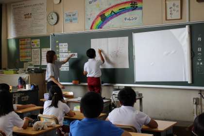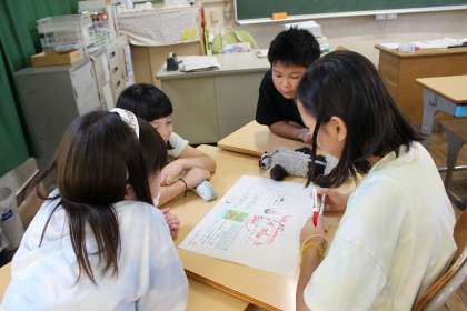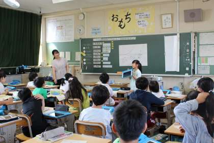 社会の時間には、県庁所在地や特産物をヒントにした都道府県クイズを作りました。算数の時間には、数のまとまりを作って見積もりを使っておよその合計を考えました。