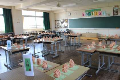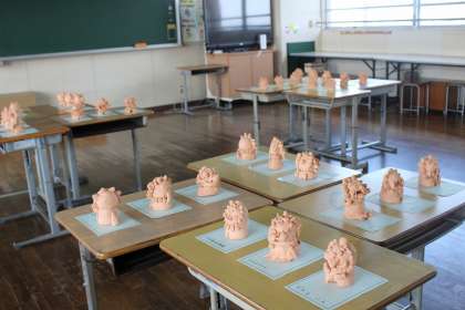 図工で作ったシーサーが焼きあがってきました。第2多目的室に展示しました。