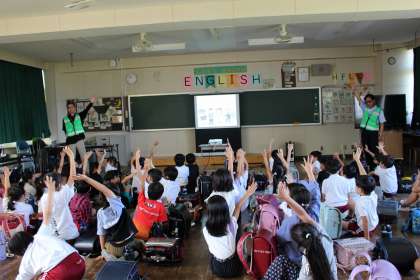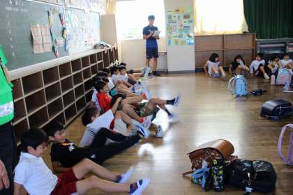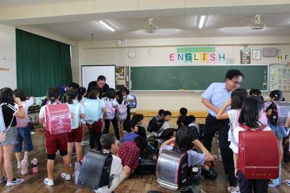 地域安全指導員を講師に迎え、防犯教室を実施しました。不審者対応「つみきおに」について教えていただきました。また、助けを呼んで逃げるシュミレーションをしたり、防犯ブザーの確認をしたりしました。