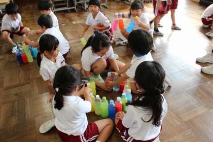 算数の時間には、鉛筆や毛糸を使って長さ比べをしました。図工の時間には、お散歩する様子を思い浮かべて粘土で作成しました。色水遊びでは、作った色水をみんなで並べて、いろいろな形を作りました。