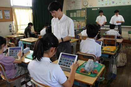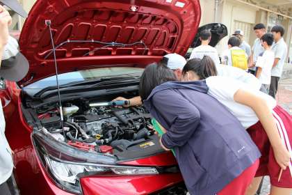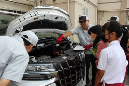 豊田工科高校の出前授業で、4コースに分かれて体験活動をしました。1組の教室では、スクラッチアプリを使用して、ピンポンゲームなどの簡単なプログラム作成をしました。2組の教室では、自動車の仕組みを知り、車の点検をしました。