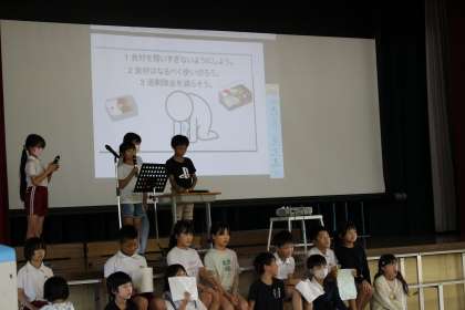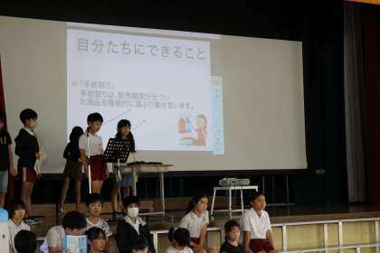 2組の学習発表会では、節水や節電、買い物の仕方の工夫などについて、調べたことや自分たちにできることを、劇やクイズを交えながら発表しました。