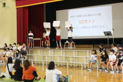 3組の学習発表会では、ゴミの分別や食品ロスをなくすための取り組みについて発表しました。自分たちで作ったエコについてのお便りを保護者の皆さんに配付しました。発表の最後には「この星に生まれて」を合唱しました。