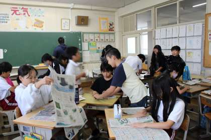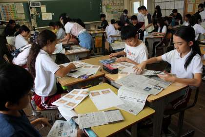 総合の時間には、防災学習で新聞スリッパを作成しました。
