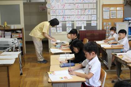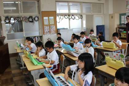 国語の時間には、「サラダでげんき」に出てくる動物がくれたアドバイスについてまとめました。音楽の時間には、鍵盤ハーモニカで「ひのまる」の演奏をしました。