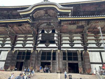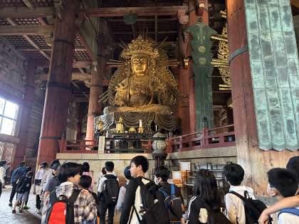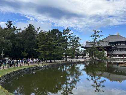 鏡池の前で集合写真をとり、大仏殿を見学しています。