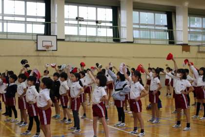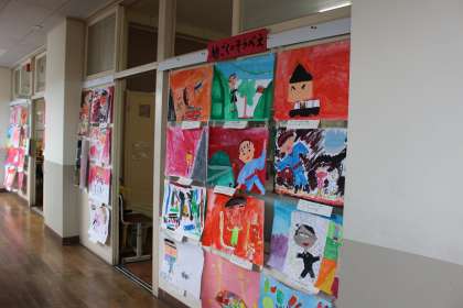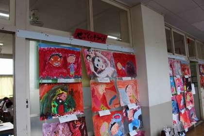 図工の時間に描いた読書感想画「じごくのそうべえ」を掲示しました。体育館で運動会の踊りの練習をしました。