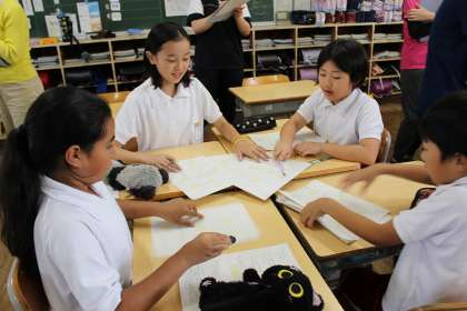 国語の時間には、グループごとに作った和洋新聞の読み合いをしました。算数の時間には、長方形や正方形の面積の公式を使って、工夫して面積を求める方法を考えました。