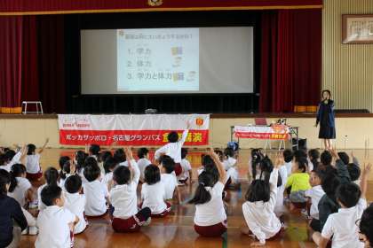 グランパス食育講座を行いました。元気な体を作るためにどんな食事をとったらよいのかを教えていただきました。グランパスの選手からのメッセージもいただきました。