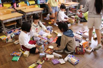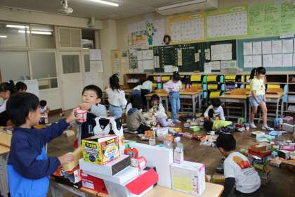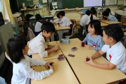 算数の時間には、いろいろな箱を使って、積んだり並べたりしながら形づくりを楽しみました。生活科では、百人一首を使って「ぼうずめくり」を楽しみました。