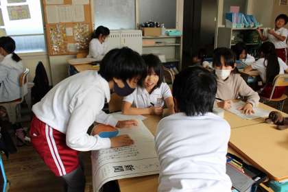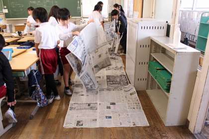算数の時間には、大きな面積の求め方について考えました。また、1平方メートルの新聞紙を使って、教室や廊下などの面積を求めました。国語の時間には、和と洋を比べることをテーマにした新聞づくりをしました。