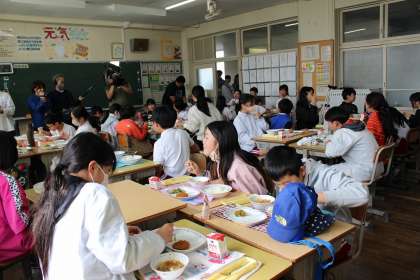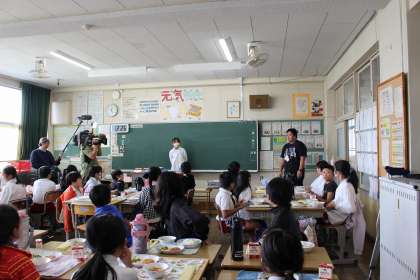 給食の時間に、テレビ番組の撮影がありました。楽しく会食をしました。