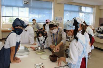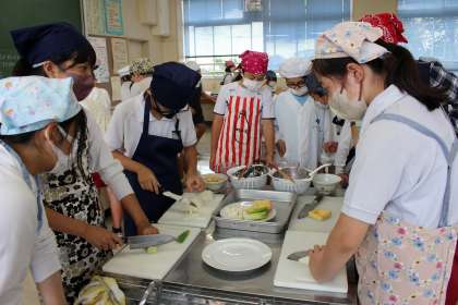 家庭科の時間には、みそ汁の調理実習を行いました。煮干しでだしを取り、具材に合わせて切り方を工夫しました。