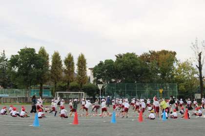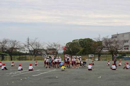 運動会のダンスや玉入れなどの練習を、若林こども園の年長さんが見学に来ました。「がんばれ」の声援が校庭に響きました。