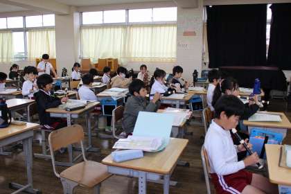 算数の時間には、かけ算の筆算の計算練習をしました。音楽の時間には、「あの雲のように」をリコーダーで演奏しました。