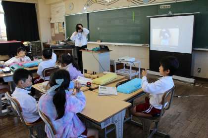 国語の時間には、イラストを見ながらまとめてよぶ言葉を考えました。音楽の時間には、トライアングルやカスタネットなどの打楽器の使い方を学習しました。