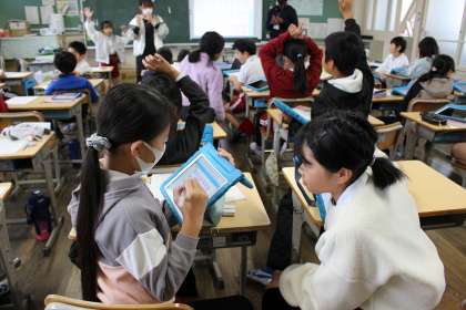 外国語の時間には、学習用タブレットを使ってアルファベットの大文字と小文字をマッチングするゲームをしました。