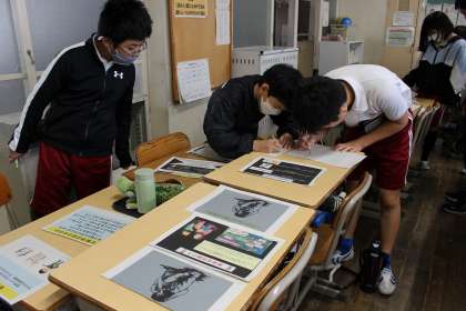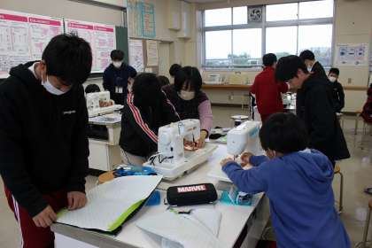 国語の時間には、SDGsにかんするプレゼンを鑑賞しました。家庭科の時間には、ボランティアの方に支援していただきながら、ナップザックづくりをしました。