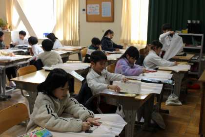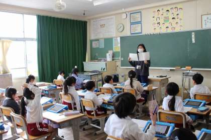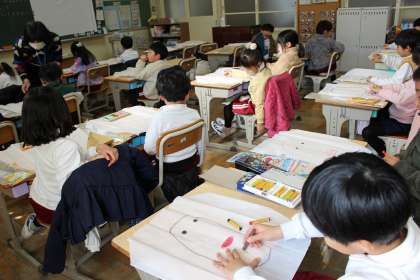 図工の時間には、凧に好きな絵をかきました。国語の時間には、お話づくりをしました。