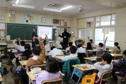 外国語活動「What's this?」では、ヒントをもとに何の食べ物なのか、どんな動物なのかを考えました。