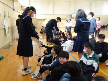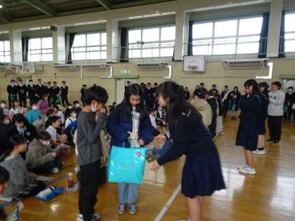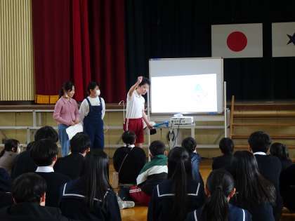 豊田南高校生が来校し、エコに関する発表をしてくれました。ブースに分かれて、発表を聞き、1ブースは4年生が担当しました。最後に手作りのポーチなどをプレゼントしてくれました。