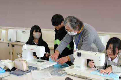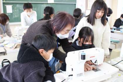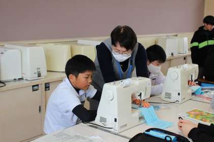 家庭科の時間には、ボランティアの方に教えていただきながら、ミシン縫いを練習しました。