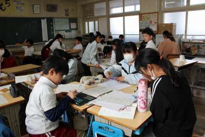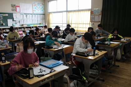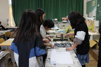 書写では、自分の好きな言葉を書きました。国語の時間には、グループごとにテーマを作りみんなにアンケートをとった結果についてグラフ等にまとめ、傾向を分析しました。図工の時間には、自画像の版画の印刷をしました。