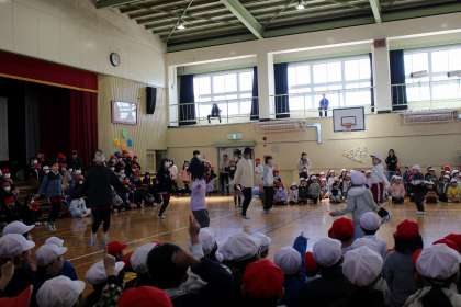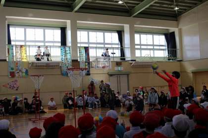 6年生を送る会で、3年生は「若林のおどり」、4年生はどちらが勝つでしょうゲームをし、会場を盛り上げました。5年生からは、思い出のスライドショーをプレゼントしました。