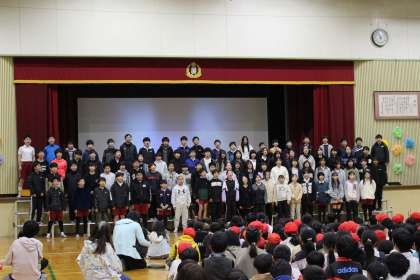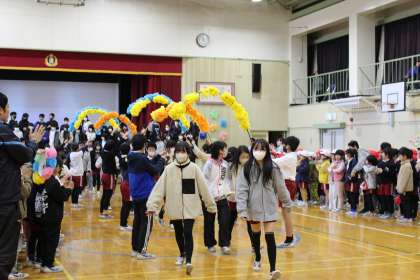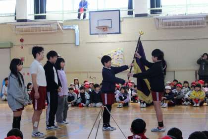 5年生が全校を代表し、6年生から校旗を引き継ぎました。明るく元気で、笑顔いっぱいの優しい若東にしていくことを誓いました。6年生からは合唱をプレゼントしてもらいました。とても温かい会になりました。