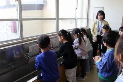 手洗いの仕方やトイレの使い方などを確認しながら、みんなでやってみました。