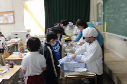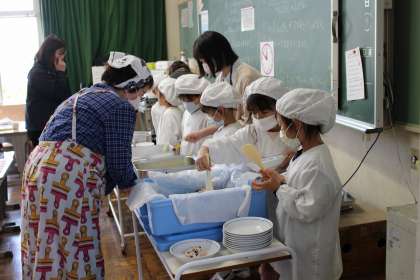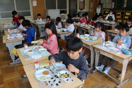 小学校で初めての給食。準備や後片付けの仕方、給食の決まりを知り、楽しい給食の時間を過ごしました。