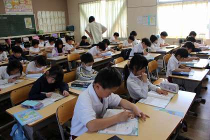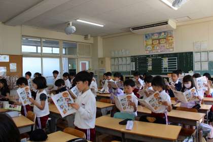 算数の時間には、表やグラフを使って数を分かりやすくあらわしました。音楽の時間には、いろいろな国のあいさつの入った歌を、2組に分かれて互いの声を聴きながら歌いました。