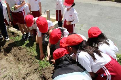理科の時間には、花壇の草取りをして、ヒマワリとホウセンカの種を植えました。