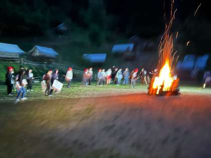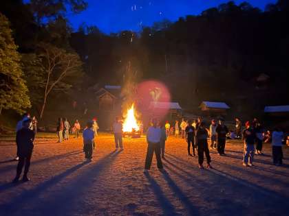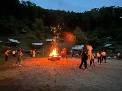 キャンプファイヤーでは、クラスの出し物や進化ゲームで盛り上がりました。