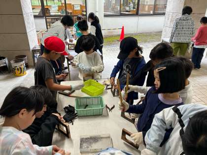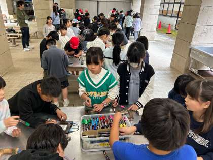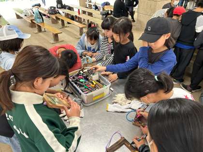 写真たてに絵や模様を描きました。キャンプにちなんだ絵や好きなキャラクターなどを描きました。