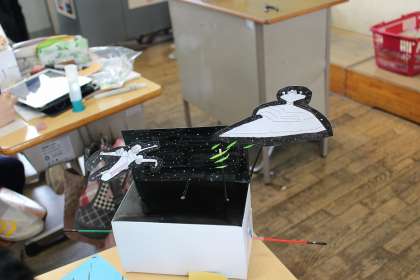図工の時間には、「くるくるクランク」の作品作りをしました。算数の時間には、分数のわり算の計算の仕方を学び、計算練習をしました。