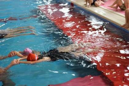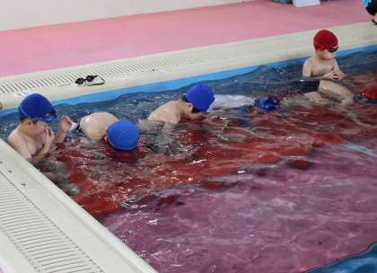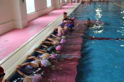 初めての水泳学習をしました。コースに分かれて、潜ったりけのびをしたりしました。