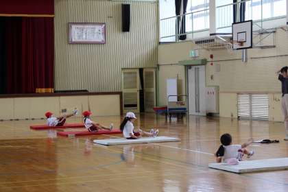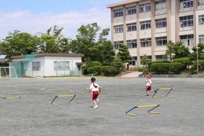 体育の時間には、ハードルを使ったかけっこや鉄棒、マット運動などをしました。