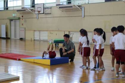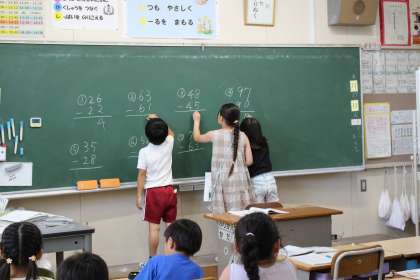 算数の時間には、筆算の計算練習をしました。体育の時間には、マット運動で後転に挑戦しました。