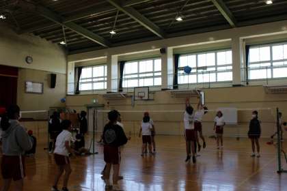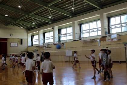 体育の時間には、1、2組合同でソフトミニバレーを楽しみました。図工の時間には、「くるくるクランク」の作品作りをしました。