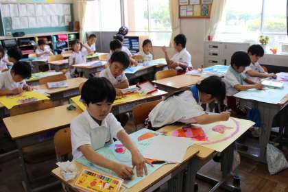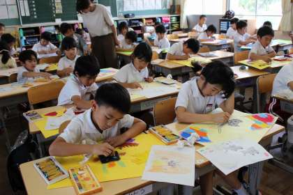 国語の時間には、「名前を見てちょうだい」の好きな場面とその理由について書きました。図工の時間には、卵から生まれた世界を自由に描きました。