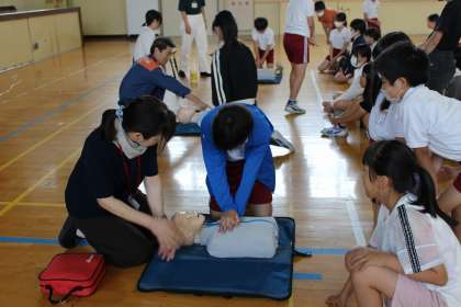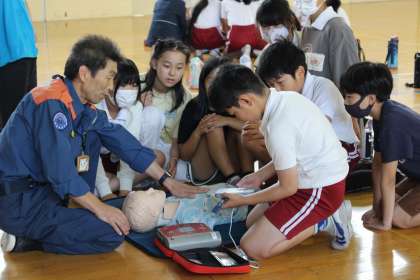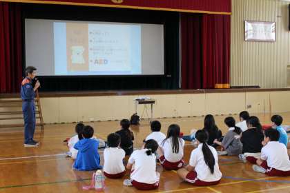 消防署の方から、胸骨圧迫の方法やAEDの使い方について教えていただきました。