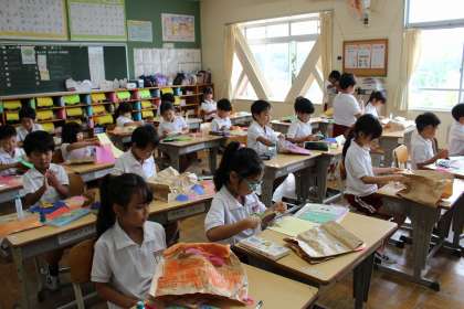 図工の時間には、紙袋を使って、オリジナルキャラクターづくりをしました。